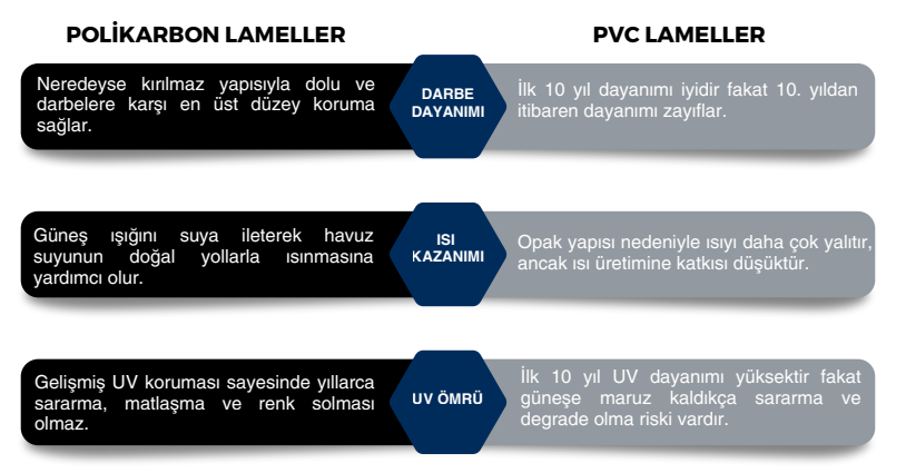 Havuz panjurları için kullanılan polikarbon ve PVC lameller arasındaki temel farklar, panjurun dayanıklılığını, ömrünü, ve havuz suyunun ısıtılmasına olan katkısını doğrudan etkiler. Polikarbon, PVC'ye göre çok daha yüksek darbe direncine sahiptir. Bu, lamellerin dolu, rüzgarla savrulan nesneler veya normal kullanım sırasındaki kazara darbeler gibi dış etkenlere karşı kırılmaya, çatlamaya veya deformasyona karşı çok daha dayanıklı olduğu anlamına gelir.